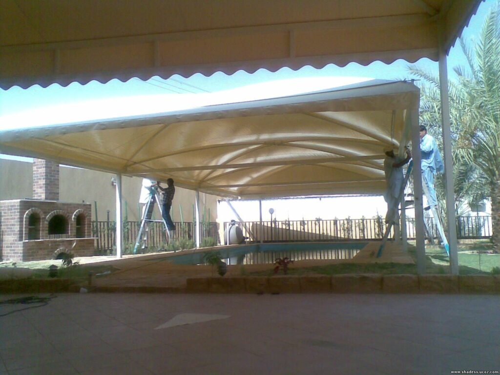 يتم تثبيت الأعمدة التي ستثبت عليها المظلة باستخدام البراغي أو الأسمنت حسب نوع المظلة. تثبيت الإطار الهيكلي: يتم تركيب الإطار المعدني أو الهيكلي على الأعمدة، والتأكد من أنه مستوي وآمن. تغطية المظلة: بعد تركيب الإطار، يتم وضع غطاء المظلة وتثبيته بشكل محكم لضمان ثباته ضد الرياح